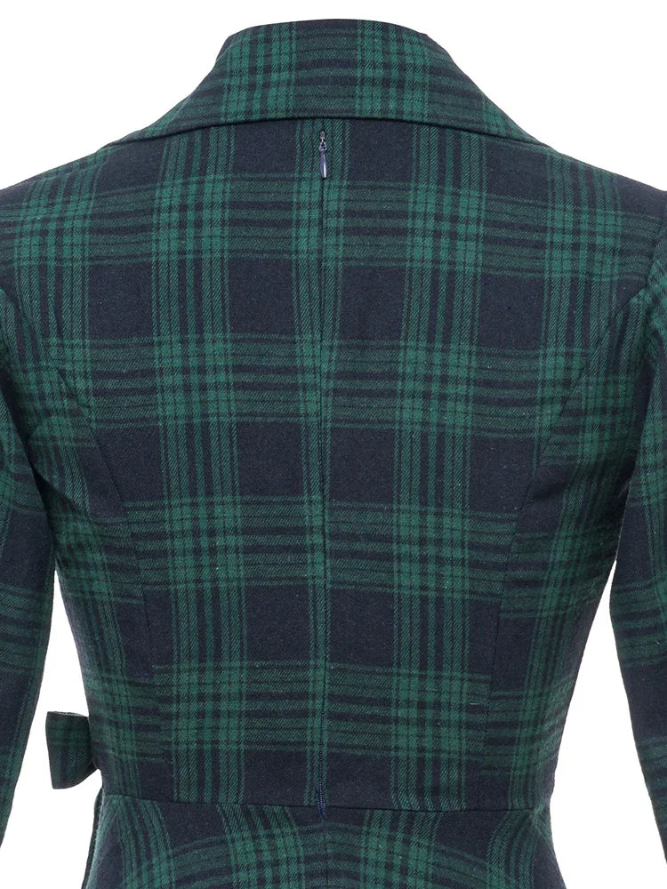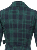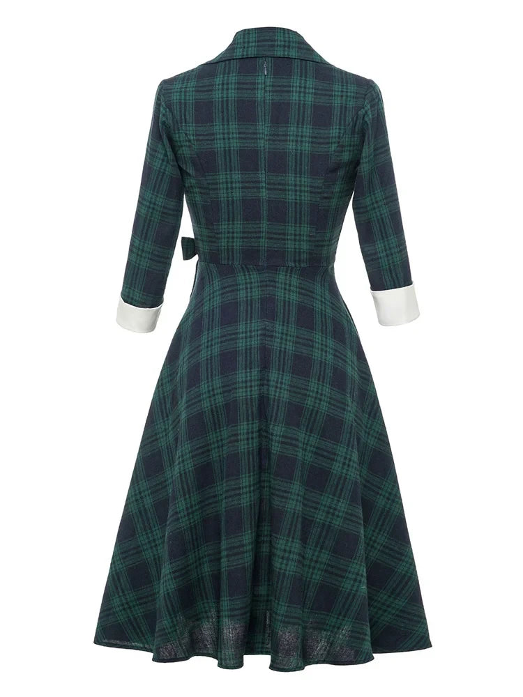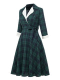 Notched Collar Green Plaid Vintage High Waist Dress Autumn Winter Women 3/4 Length Sleeve 1950S Rockabilly Midi Dresses