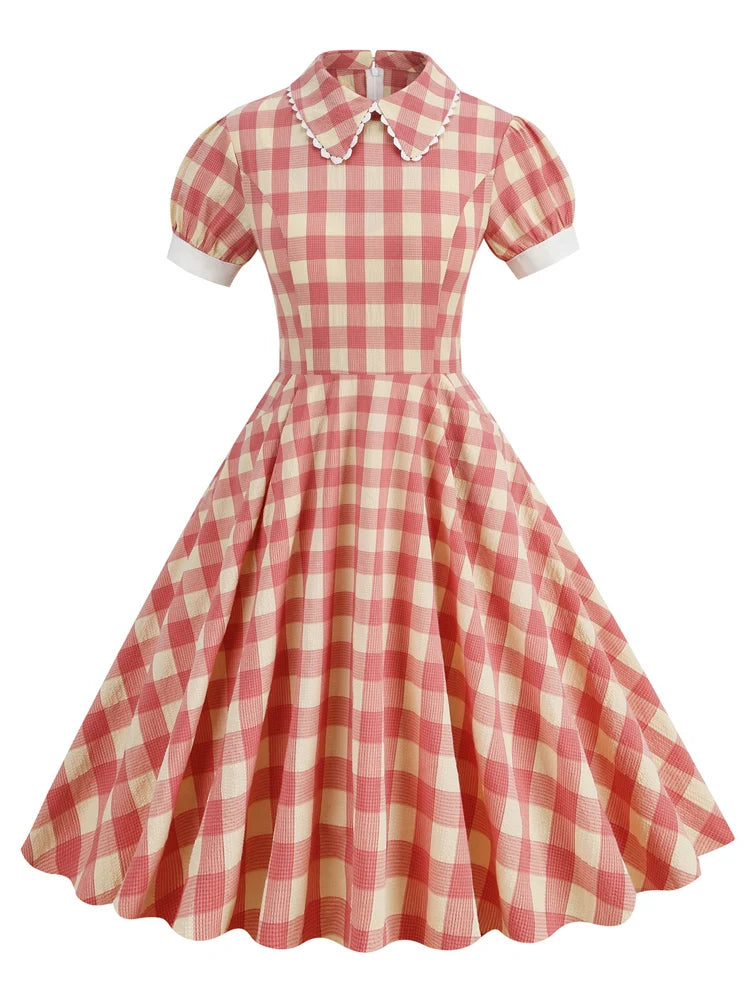 Peter Pan Collar Puff Sleeve Plaid Rockabilly Pockets Swing Dress Vintage Robe Women 1950s Elegant Midi Dresses