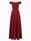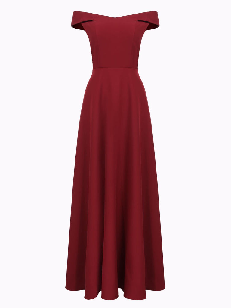 Raise your standards, dolls!?Cast in adorable wine red, this darling 1950s silhouette boasts a princess seamed bodice, secured by off-shoulder?that provide a fabulous fit to your feminine form.?Outfitted with a back zipper,?it's a marvelous stunner!