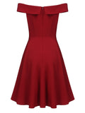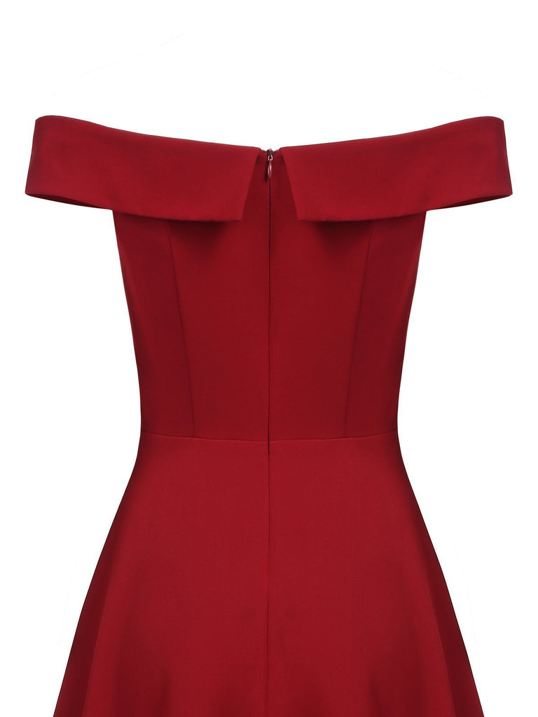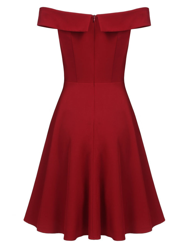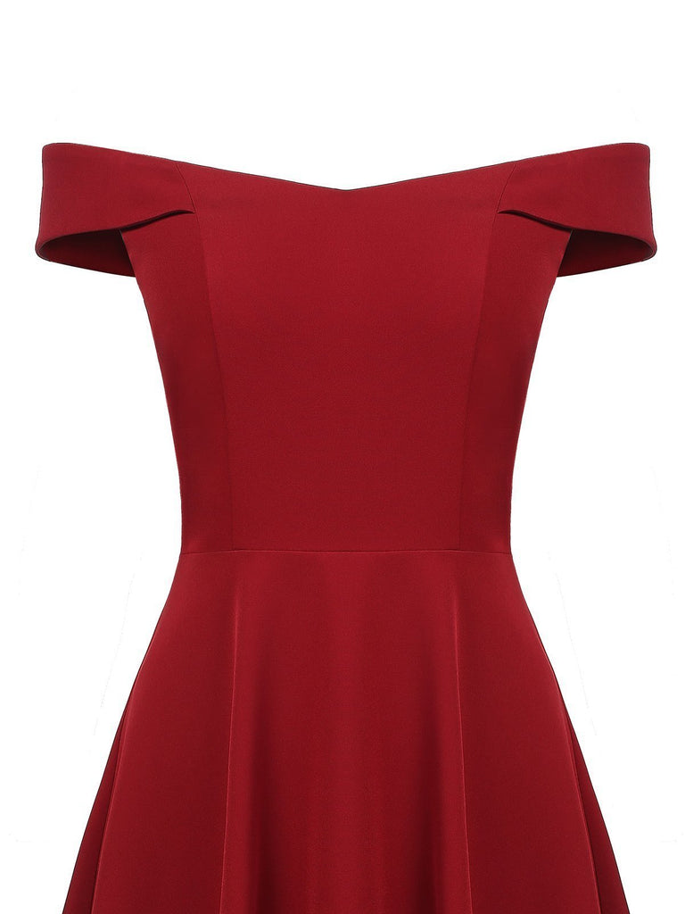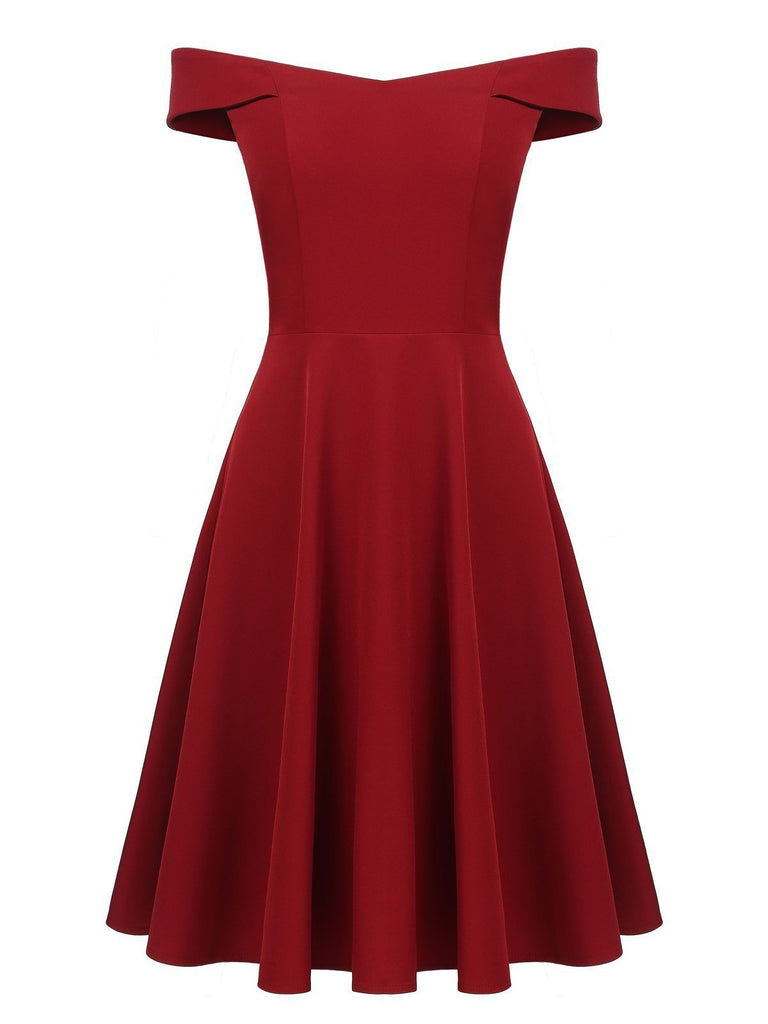 Wine Red 1950s Solid Off Shoulder Dress