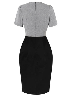 2024 Plaid Print Hepburn Style Vintage Patchwork Black Sheath Dress 1950s 60s Elegant Short Sleeve Bodycon Wrap Short Dresses