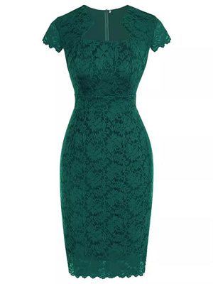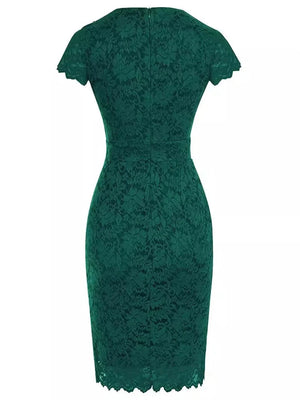 2024 Solid Green Lace Sheath Party Women's Dress Elegant Short Sleeve Bandage Retro Vintage1950s Office OL Wrap Pencil Dresses