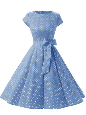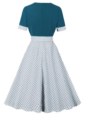 2024 Blue Polka Dot Print Vintage Patchwork Summer Swing Women Dress with Bow Elegant 1950s 60s Short Cocktail Gowns Midi Dress
