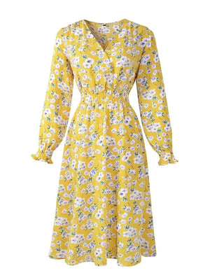 2024 Elegant Casual Floral Print A-Line Party Dress Women Spring Summer Elegant Long Sleeve Elastic Waist Boho Beach Dresses