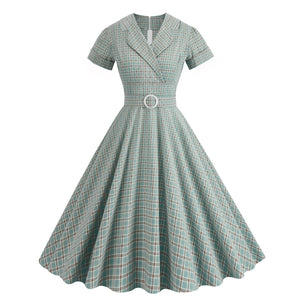 1950s Vintage Hepburn Summer Women England Short Sleeve Plaid Print Sundress Swing Pinup Cocktail Runway Midi Dress