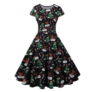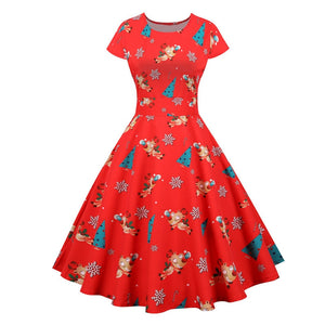 Multicolor Print Red Christmas Gift Women Party Dress Swing A Line O Neck High Waist Cap Sleeve Vintage 50S Style Clothes