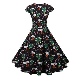 Women Christmas Dress Round Collar Vintage Santa Gift Print Dress Christmas Costume