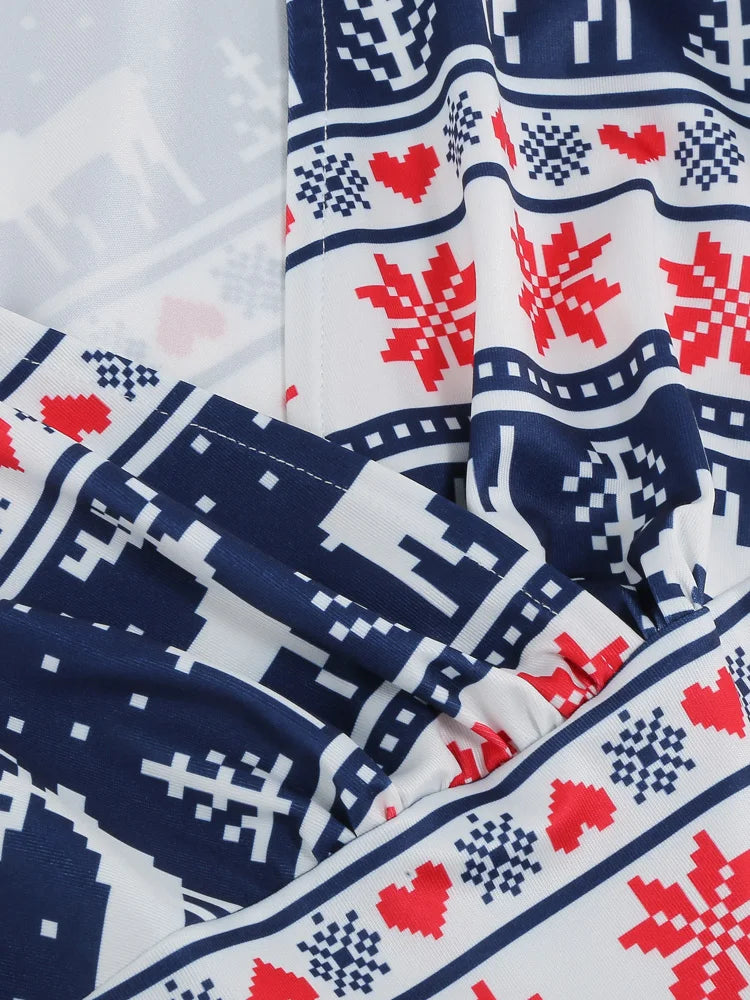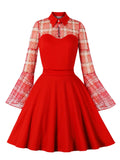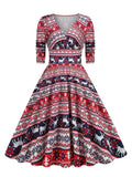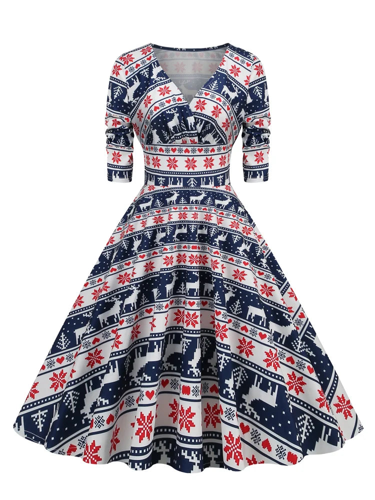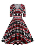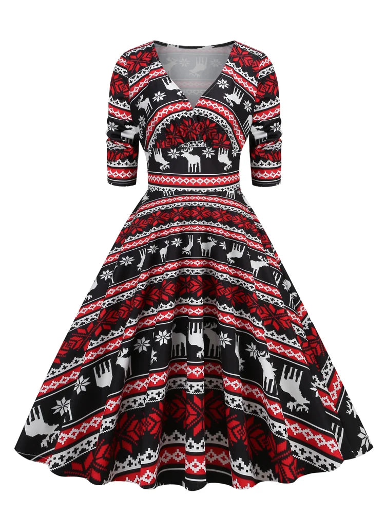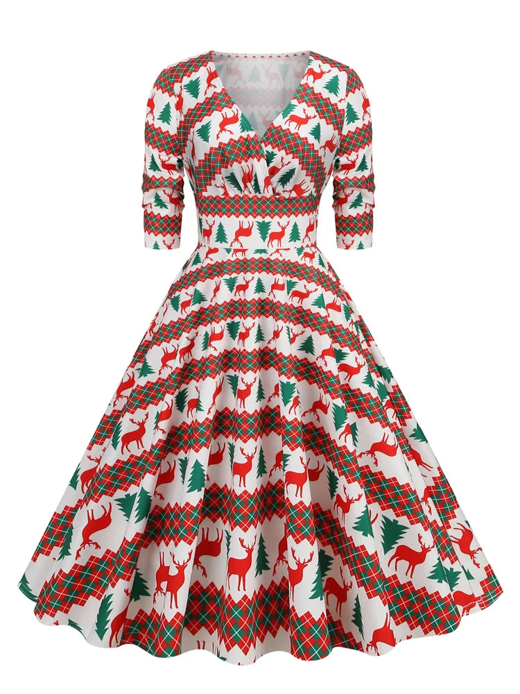 Deer and Tree Print Christmas Party Evening Winter Dress Women V-Neck High Waist 50s Vintage Swing Dresses