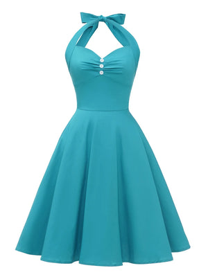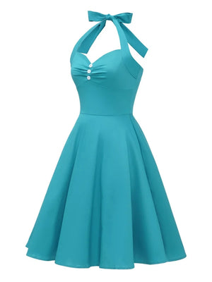 Turquoise Buttons Halter Sexy Party Backless Lace-Up Corset Dress Women 50s Style Vintage Robes Summer Swing Dresses