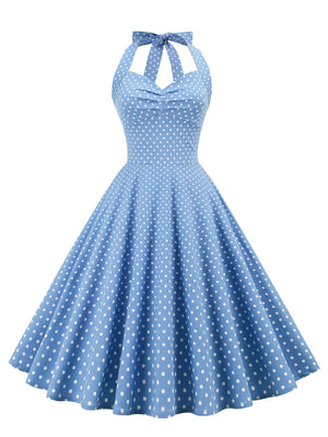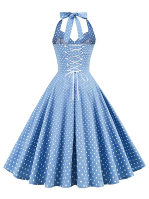 Polka Dot 50s Style Rockabilly Vintage Sexy Dresses for Women Blue Halter Lace-Up Back Party Backless Corset Dress