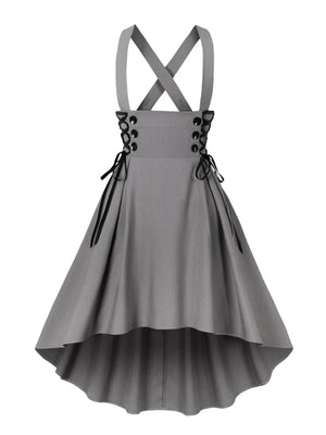 Buttons High Waist Vintage Suspender Lace-Up Corset Dress Women Harajuku Grey High Low Hem Party Pinafore Dresses