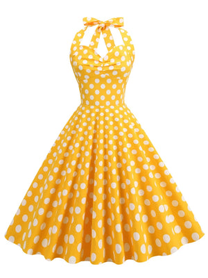 Polka Dot Yellow 1950s Vintage Pinup Belt Pleated Dresses for Women Halter Neck Corset Evening Party Cotton Dress