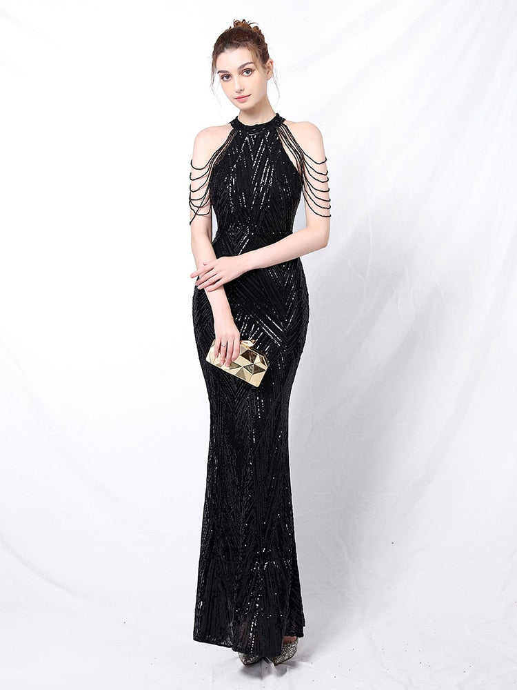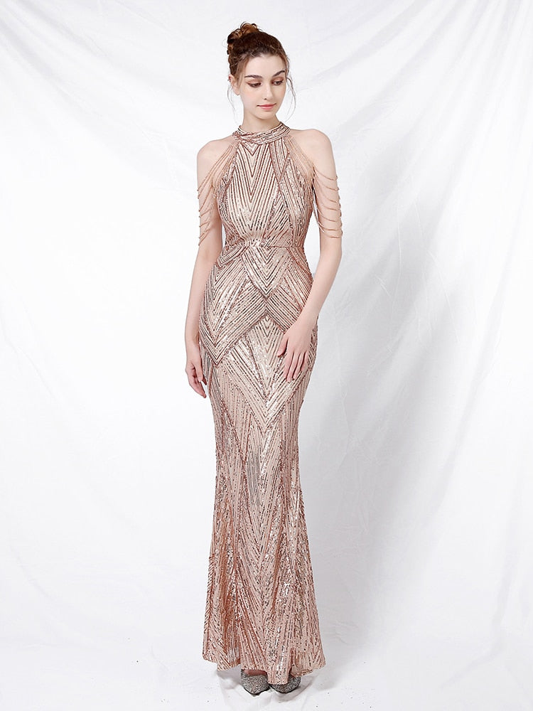 Elegant Halt Neck Diamond Sequin Embroider Formal Dress Mermaid Evening Dress Sleeveless Women Robe De Soriee Gold Vestidos