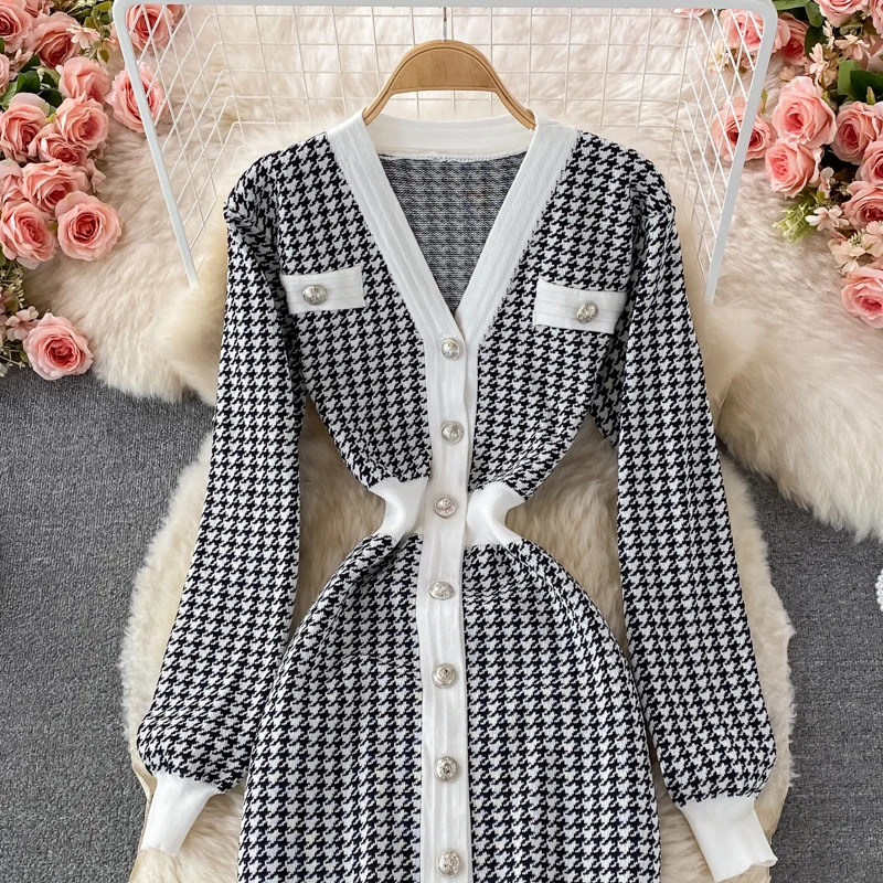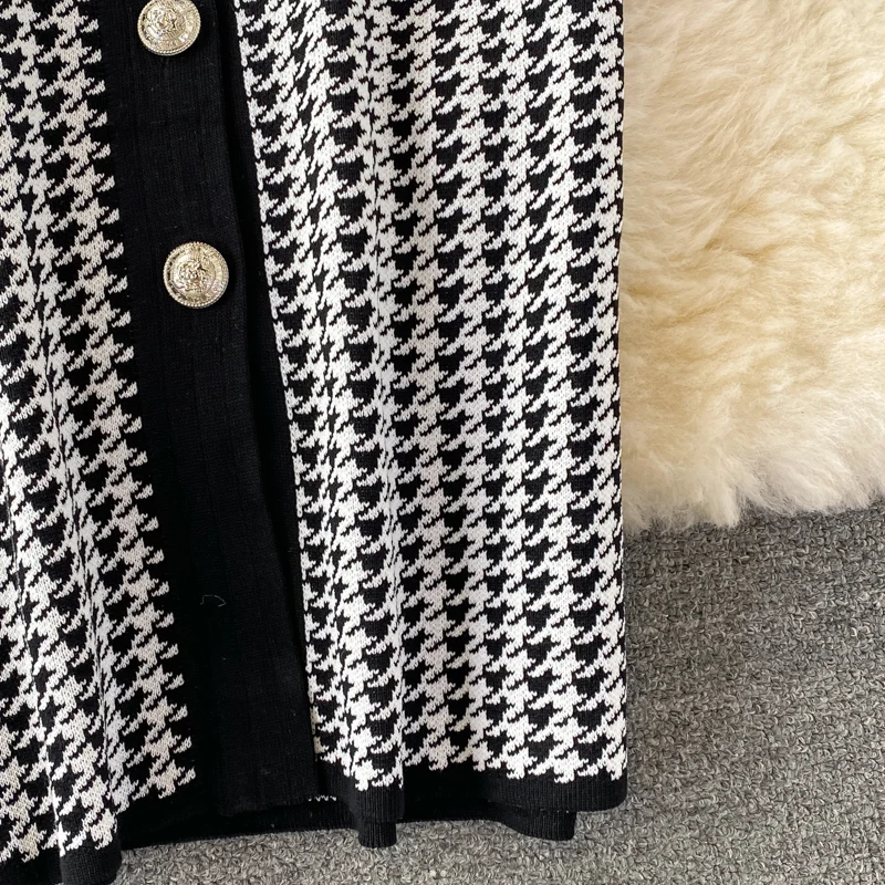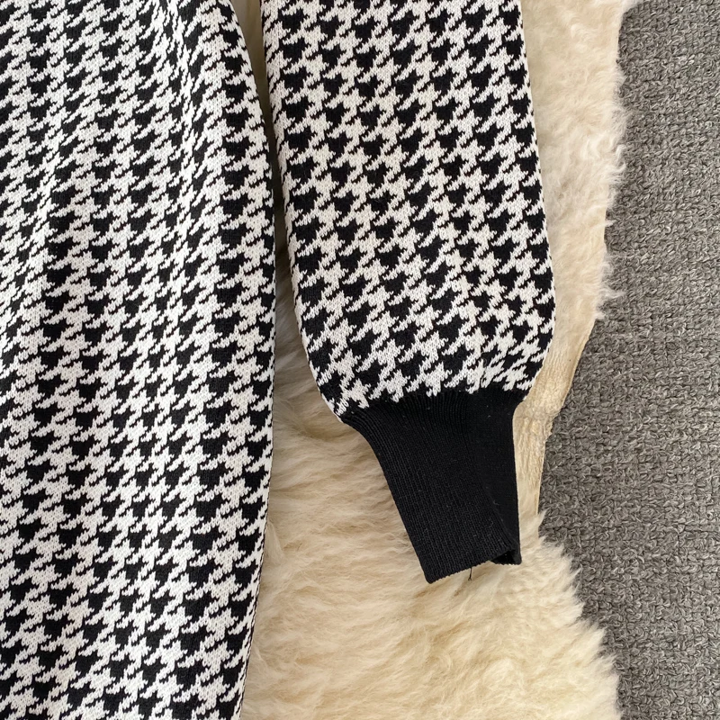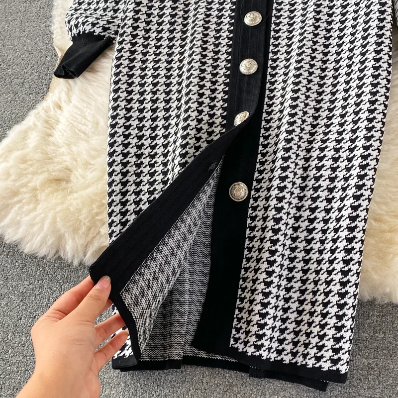 Fall Winter Elegant Office Single Breasted Cardigan Sweater Dress Houndstooth Knitted Bodycon Midi Dress