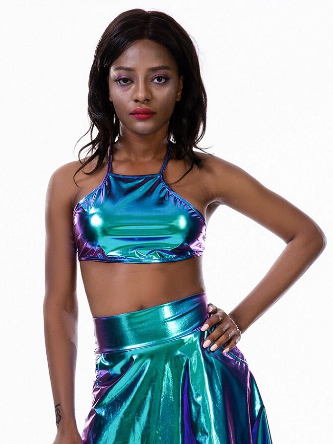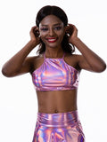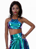 Shiny Lace-up Bra Top Halter Sleeveless Cross Back Metallic Laser Crop Top Women Club Cami Top Dance Festival Outfits