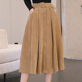 Autumn Winter Corduroy Pleated Women High Waist Large Swing A-Line Elegant Button Long Skirt