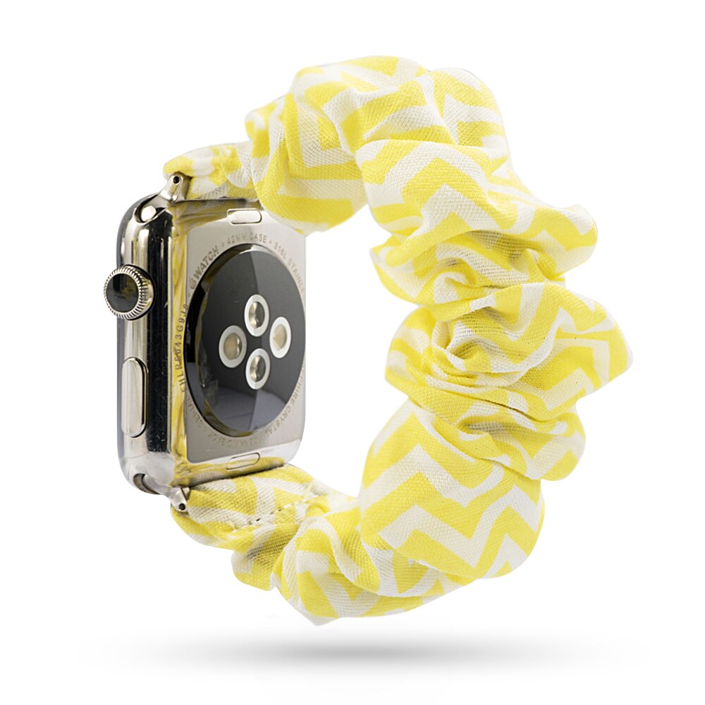 MATERIAL:Cotton,Polyester,Stainless steel.The scrunchie Watch band relaxed length is about 15.3cm, which is slightly looser if you have a smaller wrist.