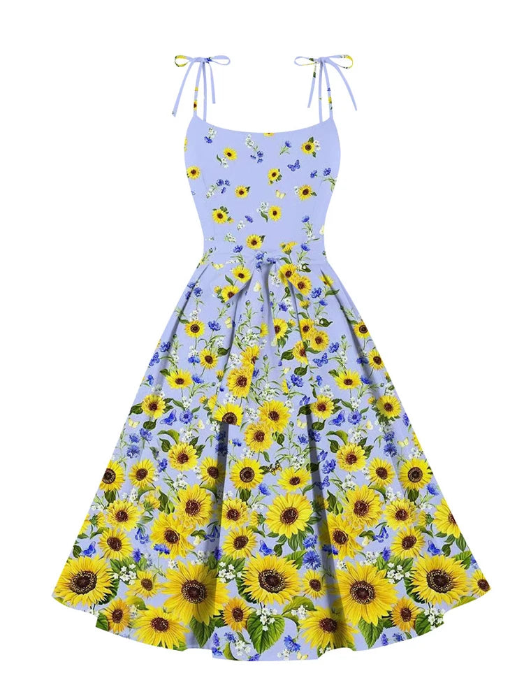 1950s Party for Women Floral Print Vintage Dress 2024 Summer Beach Vacation Outfits Spaghetti Strap Retro Sunflower Dress
