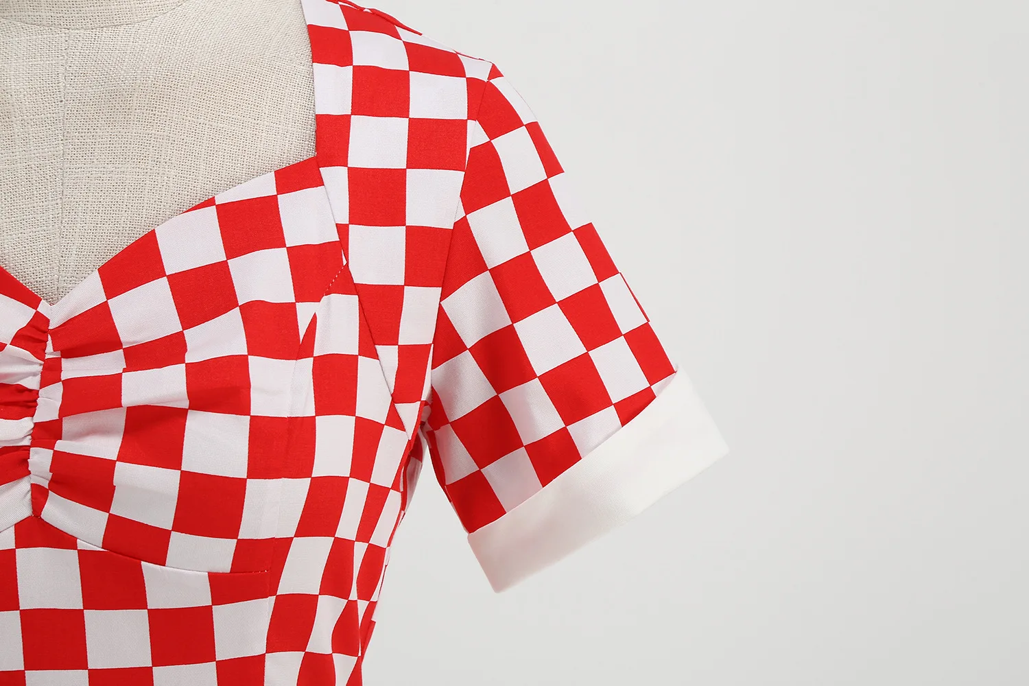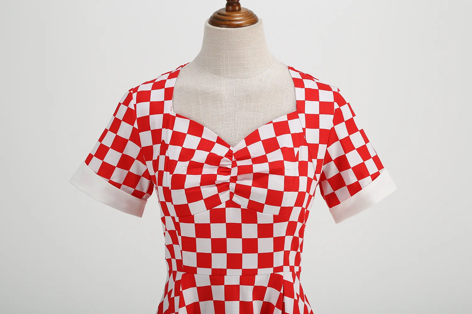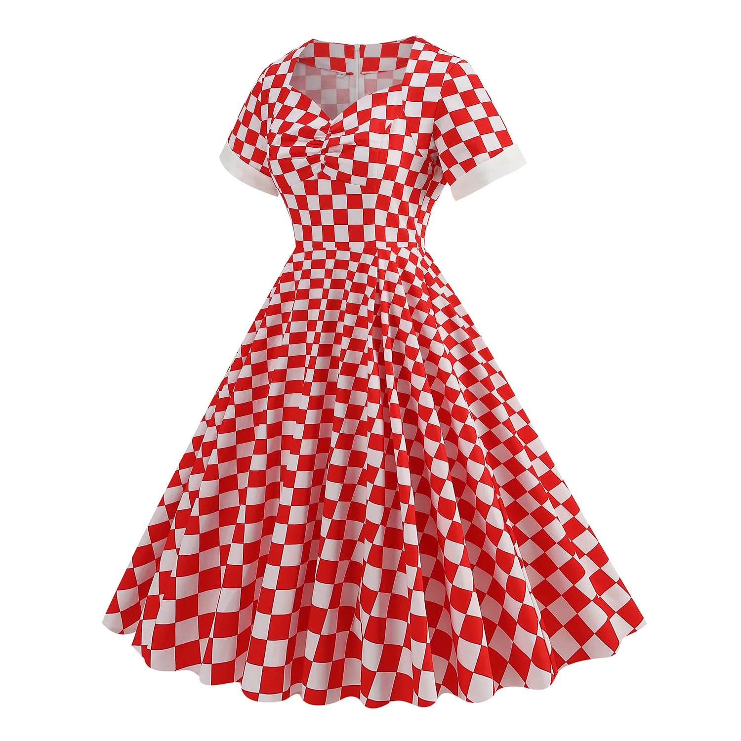 2024 Vintage Plaid Print Vintage Short Summer Casual Dress for Women Elegant V Neck A Line Swing Rockabilly Cocktail Party Dress