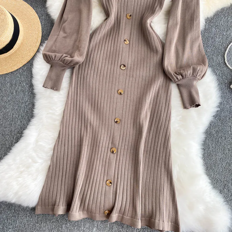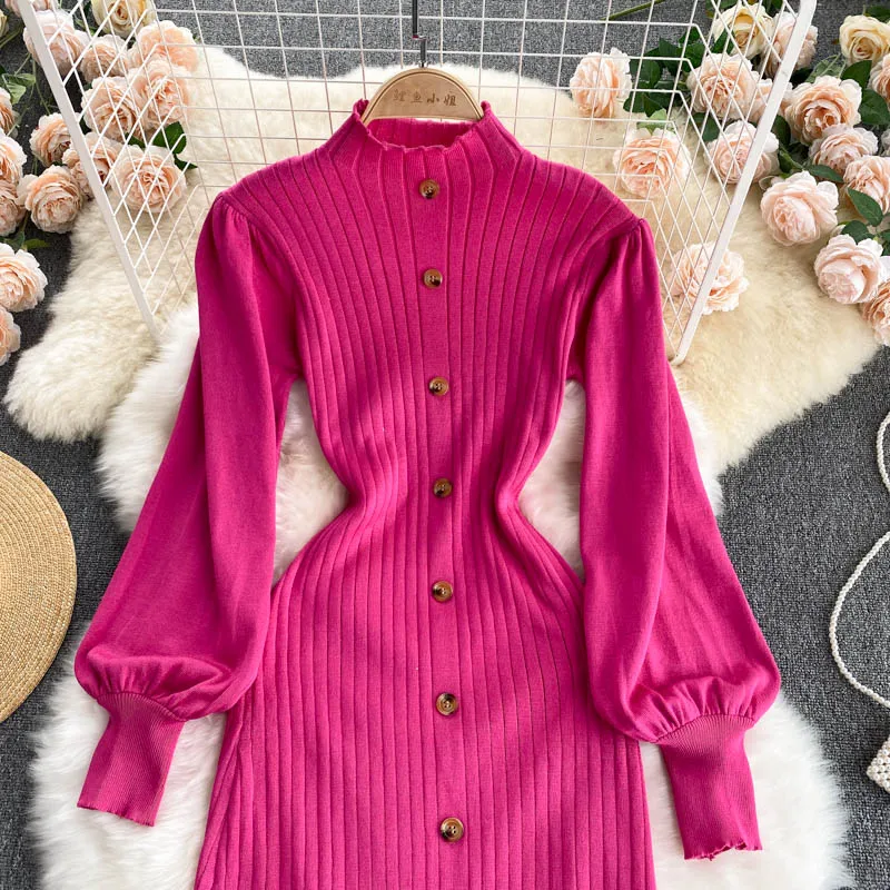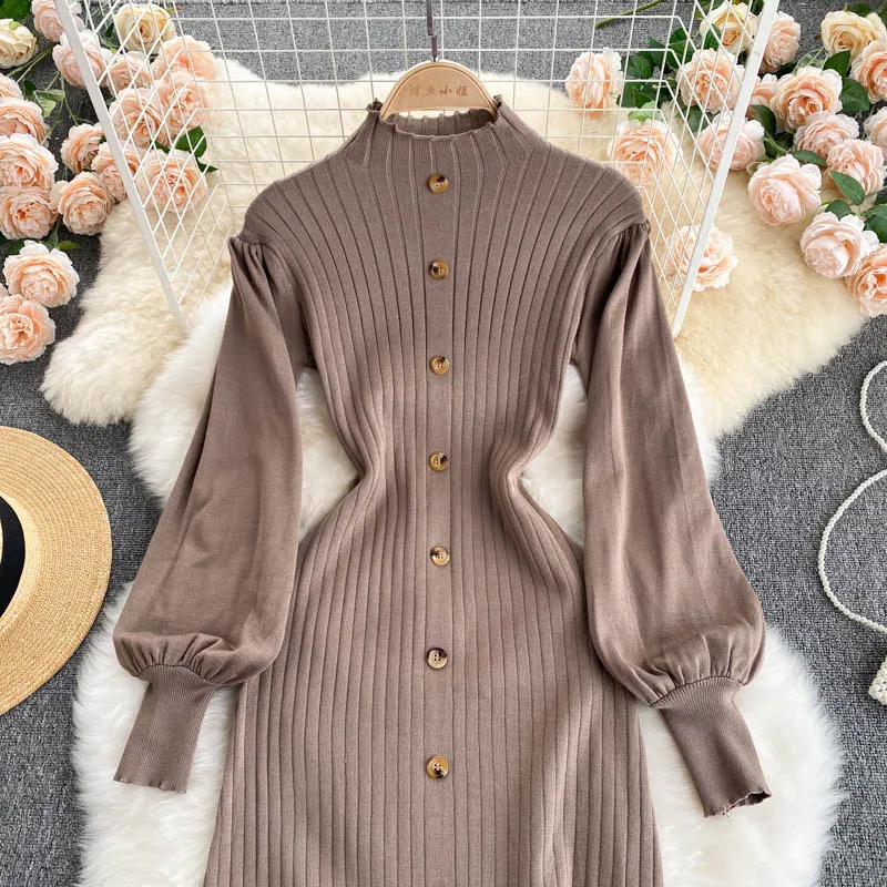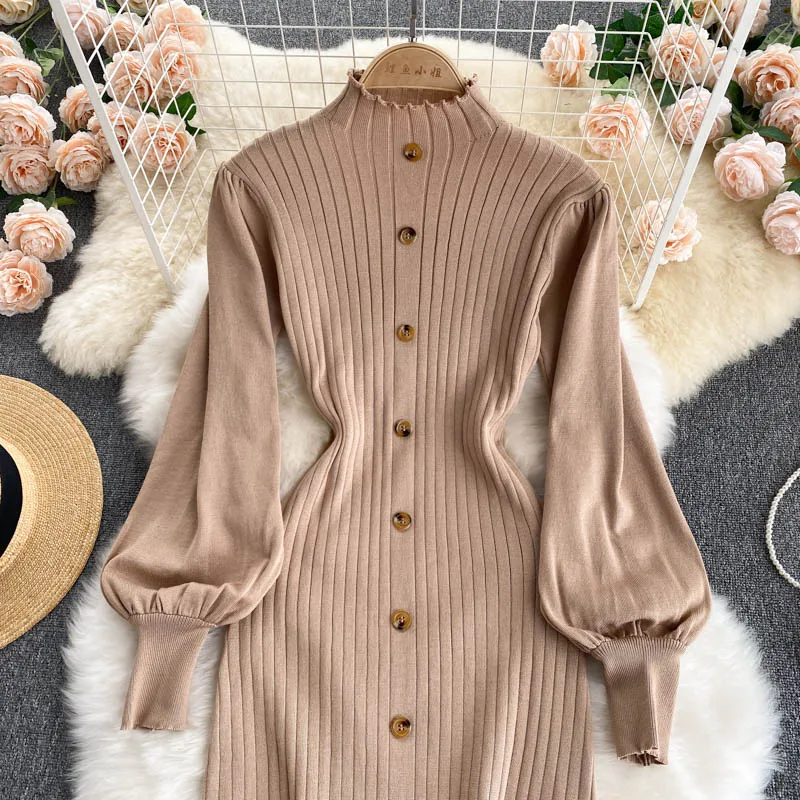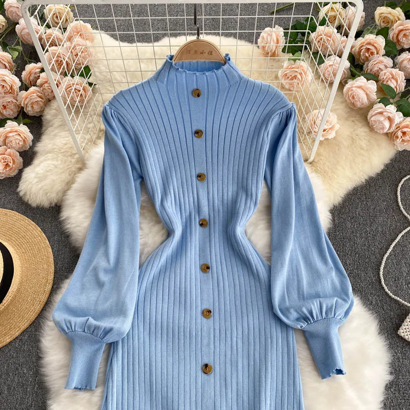 Autumn Winter Mock Neck Ribbed Sweater Dress Women Long Lantern Sleeve Front Button Elegant Knitted Bodycon Midi Dress