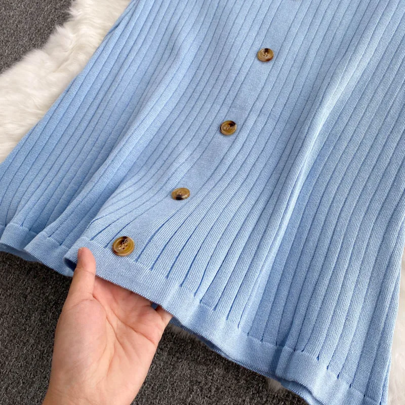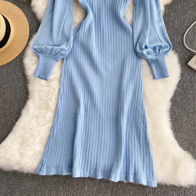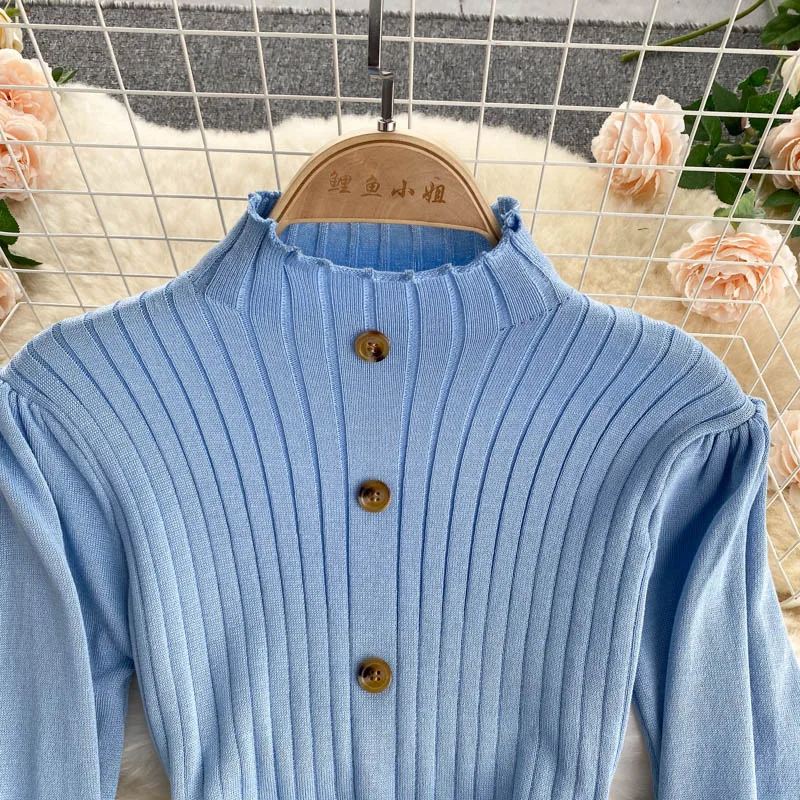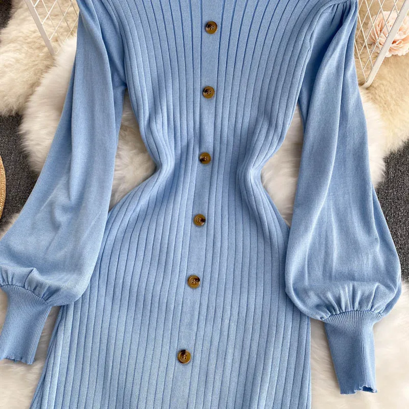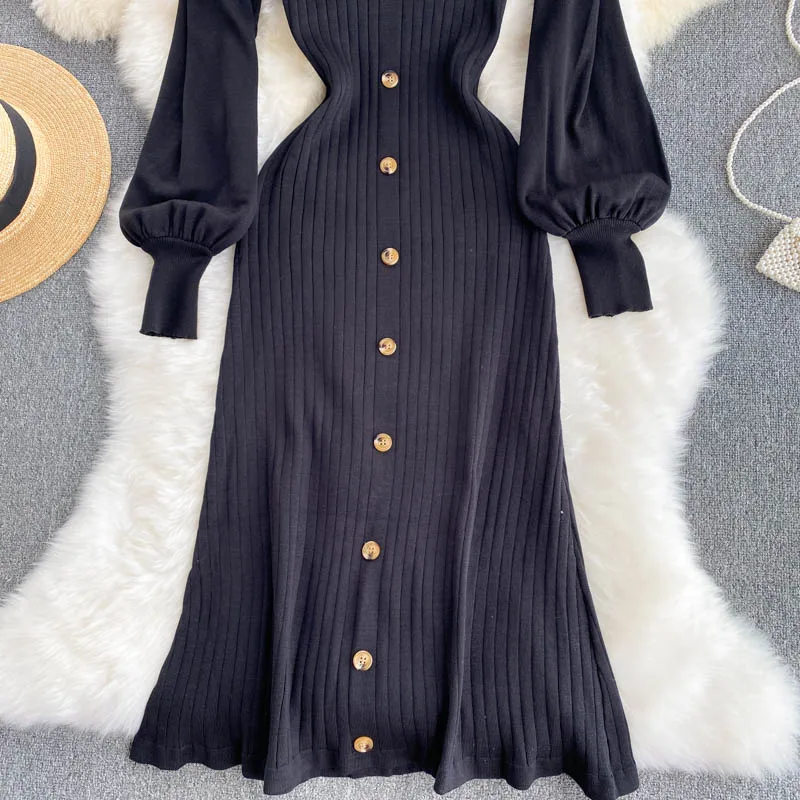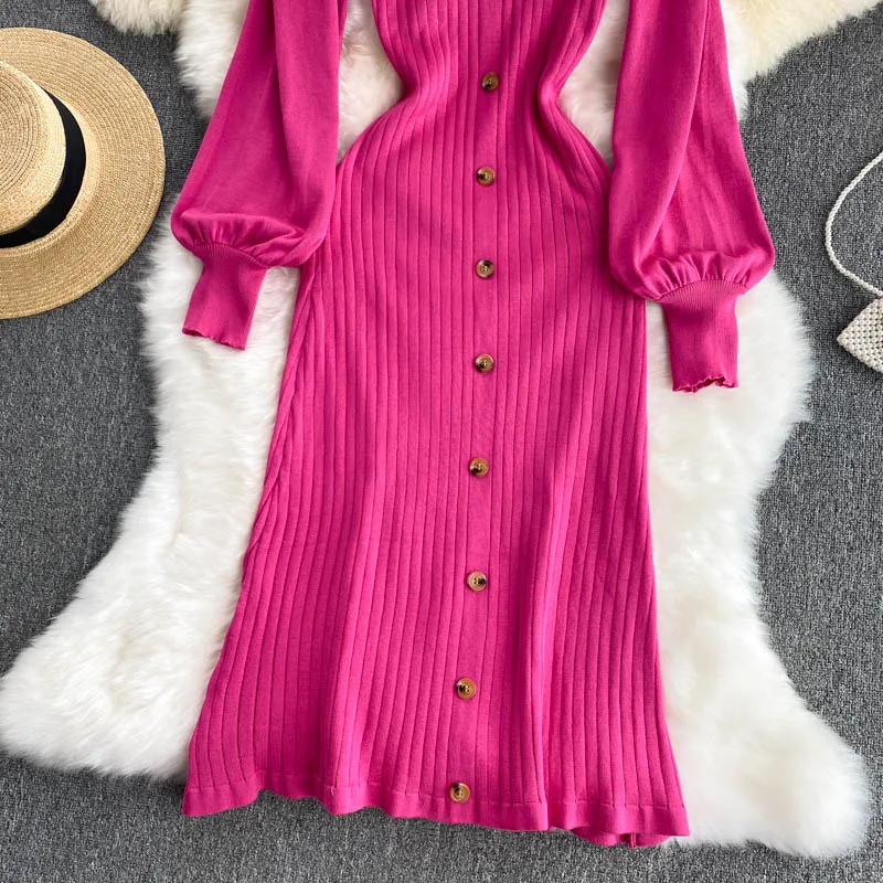 Autumn Winter Mock Neck Ribbed Sweater Dress Women Long Lantern Sleeve Front Button Elegant Knitted Bodycon Midi Dress
