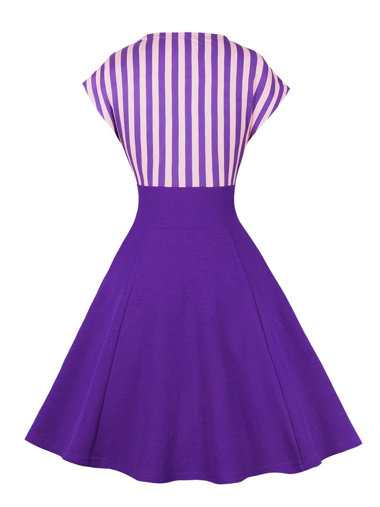 Blue Striped Patchwork High Waist A Line Summer Dress for Women V-Neck Single Breasted Vintage Dresses