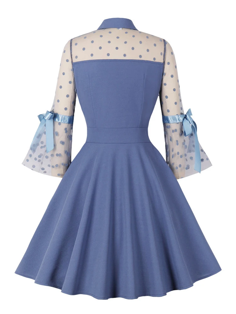 Bow Neck Dotted Mesh Sleeve Vintage A-Line Mini Dresses for Women Autumn Elegant Evening Party Pocket Dress