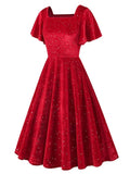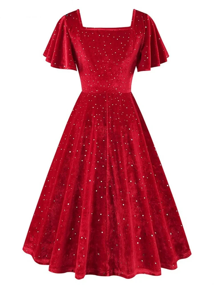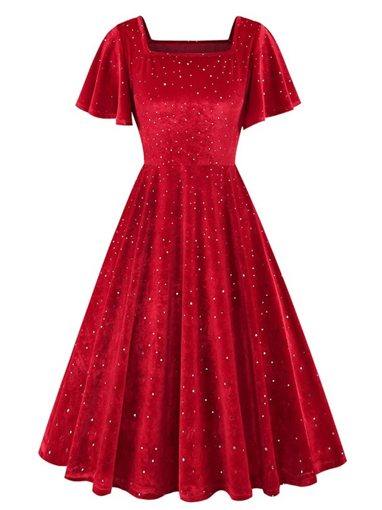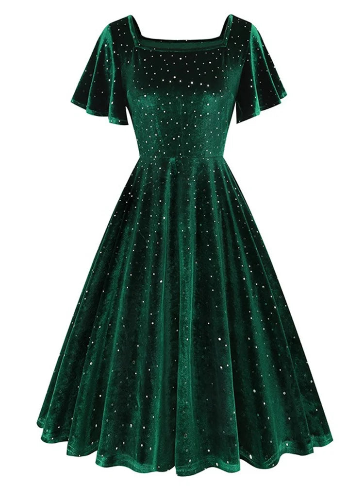 Elegant Women Vintage Velvet A Line Flare Party Dress Prom Gown Green Black Red Short Sleeve High Waist Birthday Dress for Women