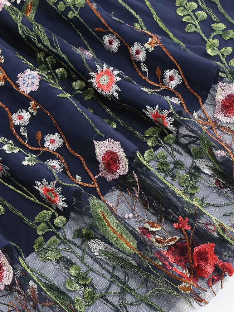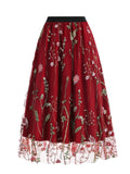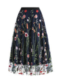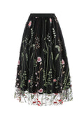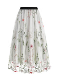 Floral Embroidered Mesh Overlay Lined Long Skirt Elastic Waist Women Elegant Festival Outfit Summer Vintage Skirts