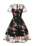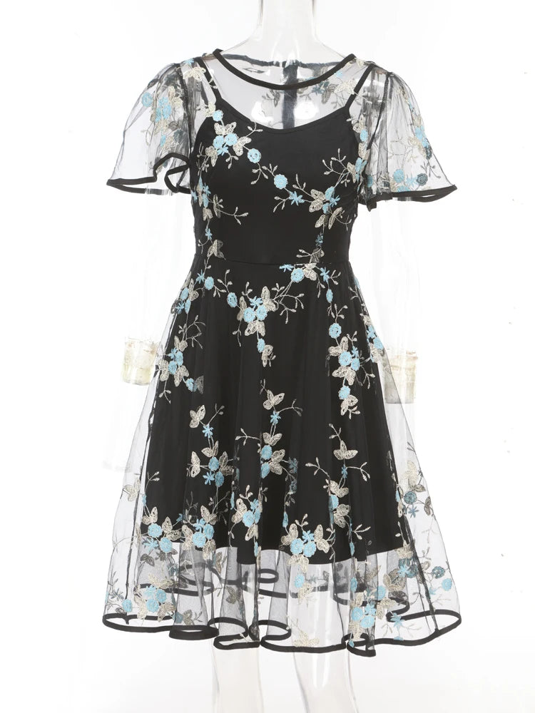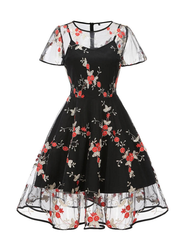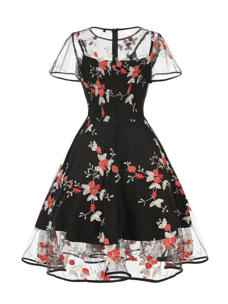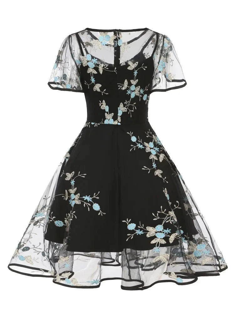Floral Embroidery Mesh Luxury Birthday Dress Prom Party Women Spring Summer Evening Vintage Style Black Dresses