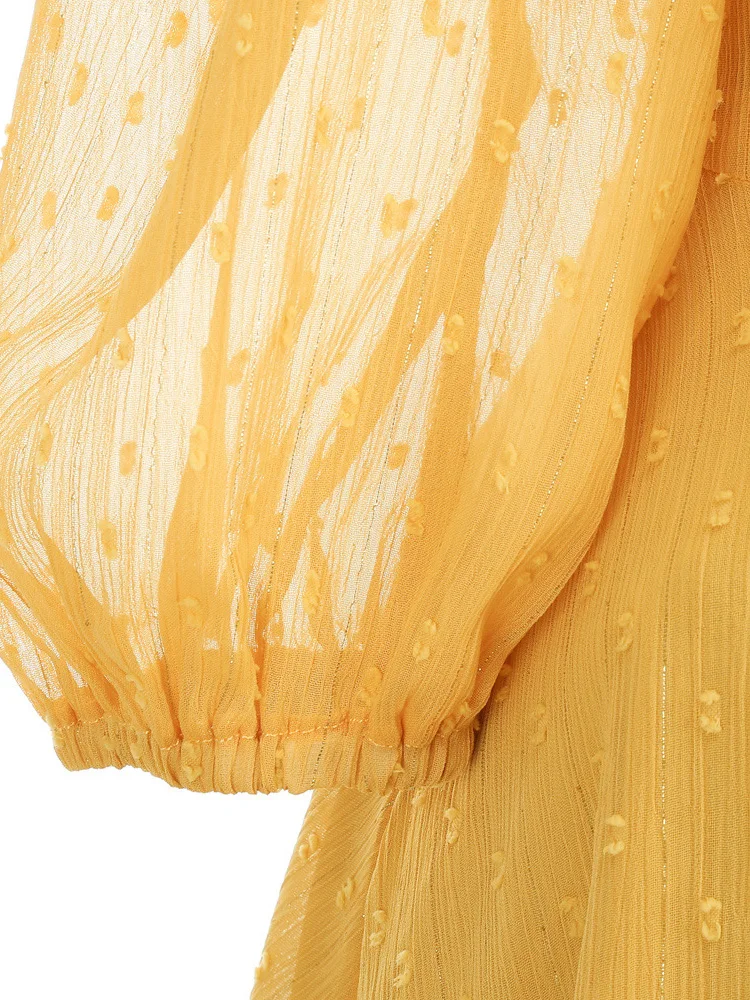 Ginger Tie Neck Hollow Out Front Swiss Dot Chiffon Elegant Midi Dresses Women Bishop Sleeve Vintage A-Line Autumn Dress