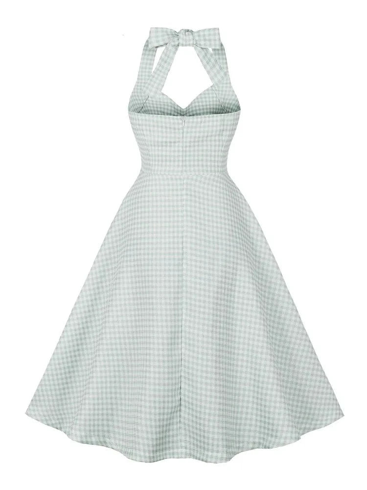 Halter V-Neck Green and White Plaid Textured Dresses Prom Women Cocktail Night Party Vintage Retro Backless Sexy Dress