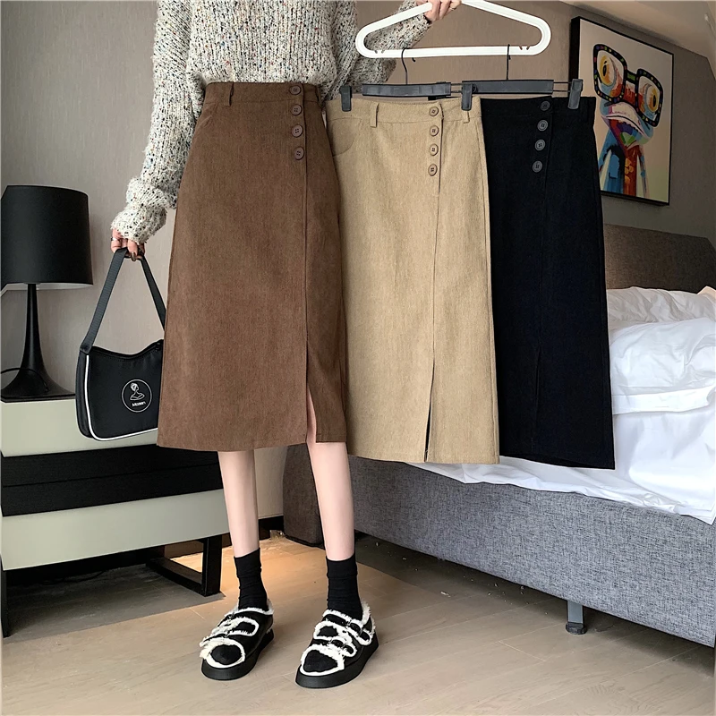 High Waist Long Women Spring Korean Style All-match Vintage Corduroy Ladies Elegant Pencil Skirt