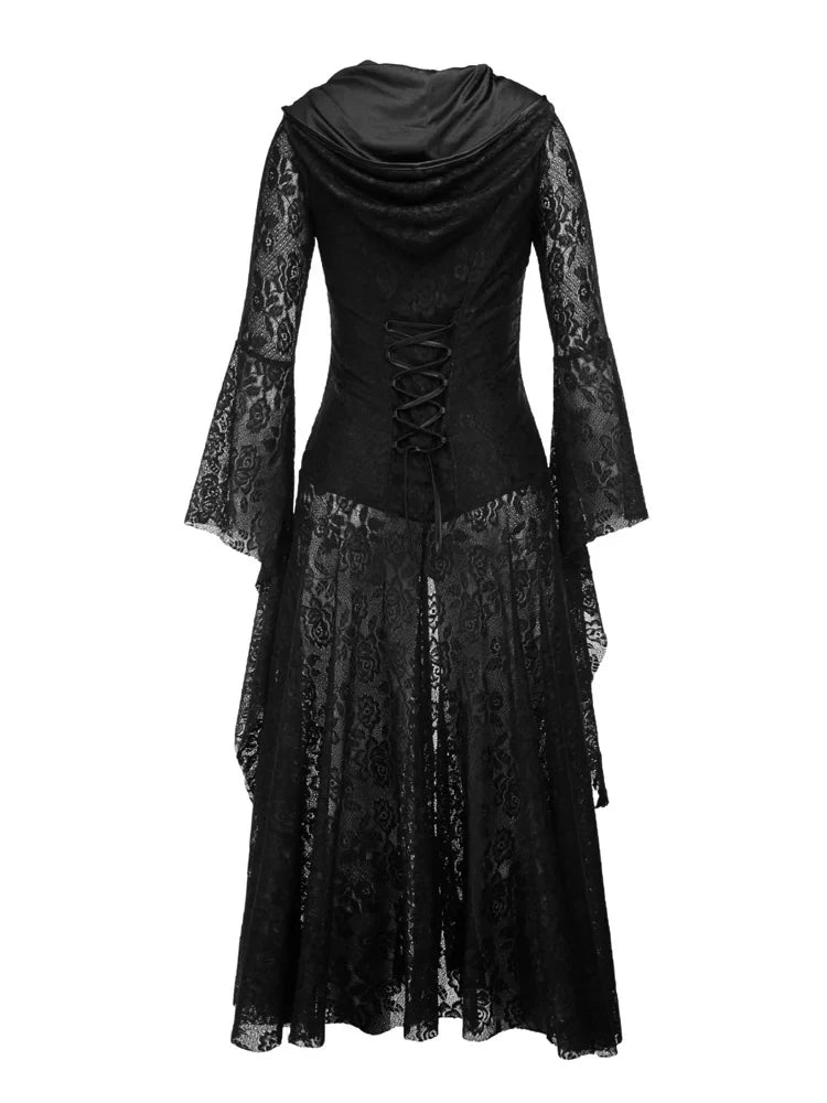 Hooded Black Lace Gothic Clothes Lolita Dresses for Women Flare Sleeve Lace-Up Back Medieval Vintage Maxi Dress