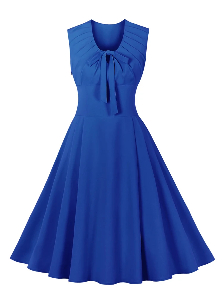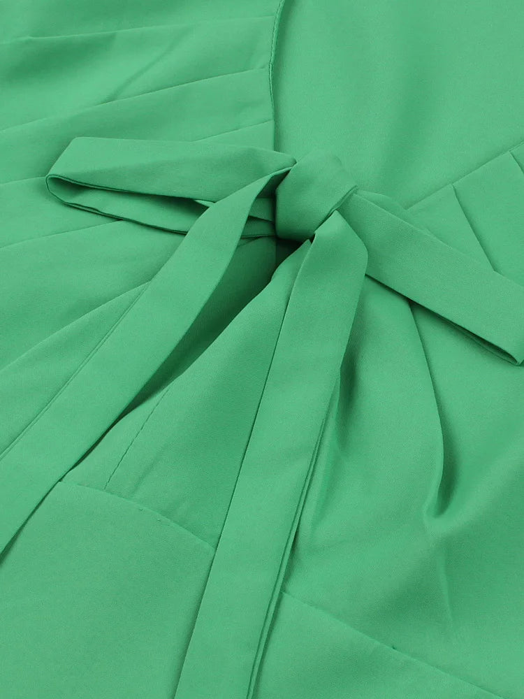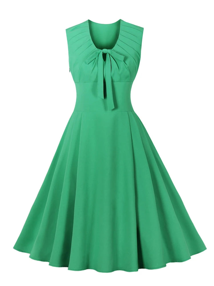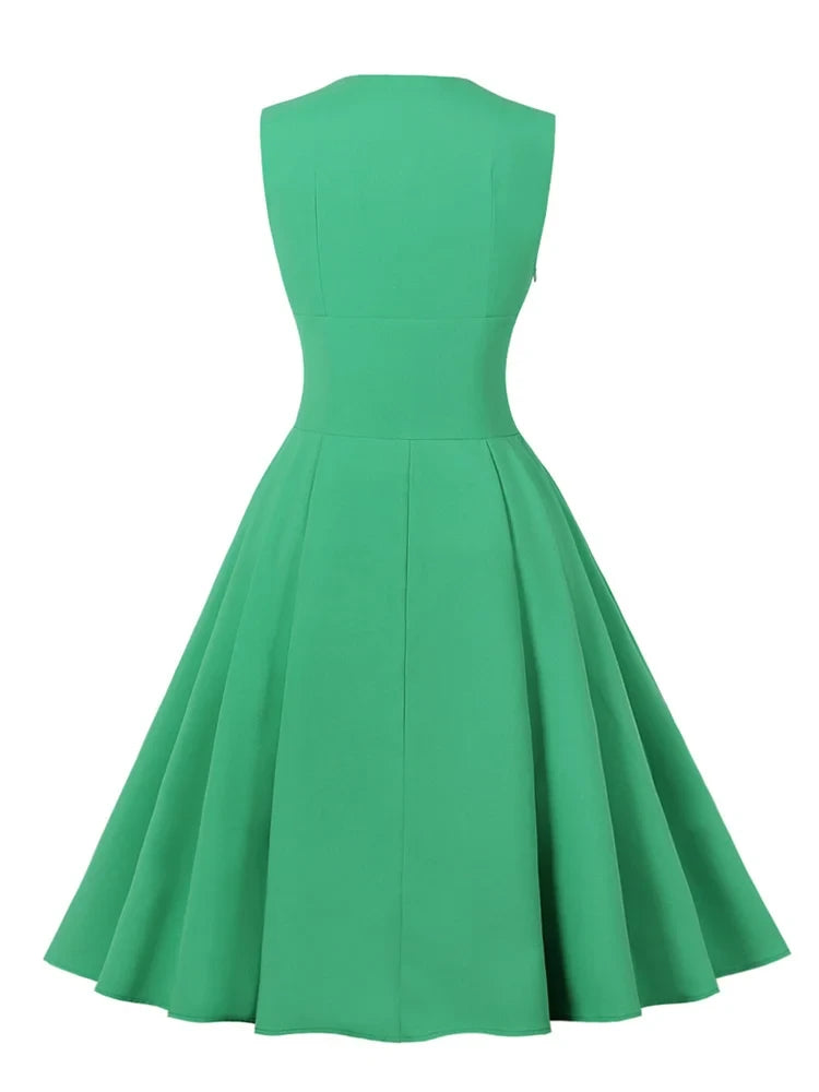 Knot V-Neck Ruched High Waist Green Solid A-Line Swing Dresses for Women Vintage Style Sleeveless Summer Dress