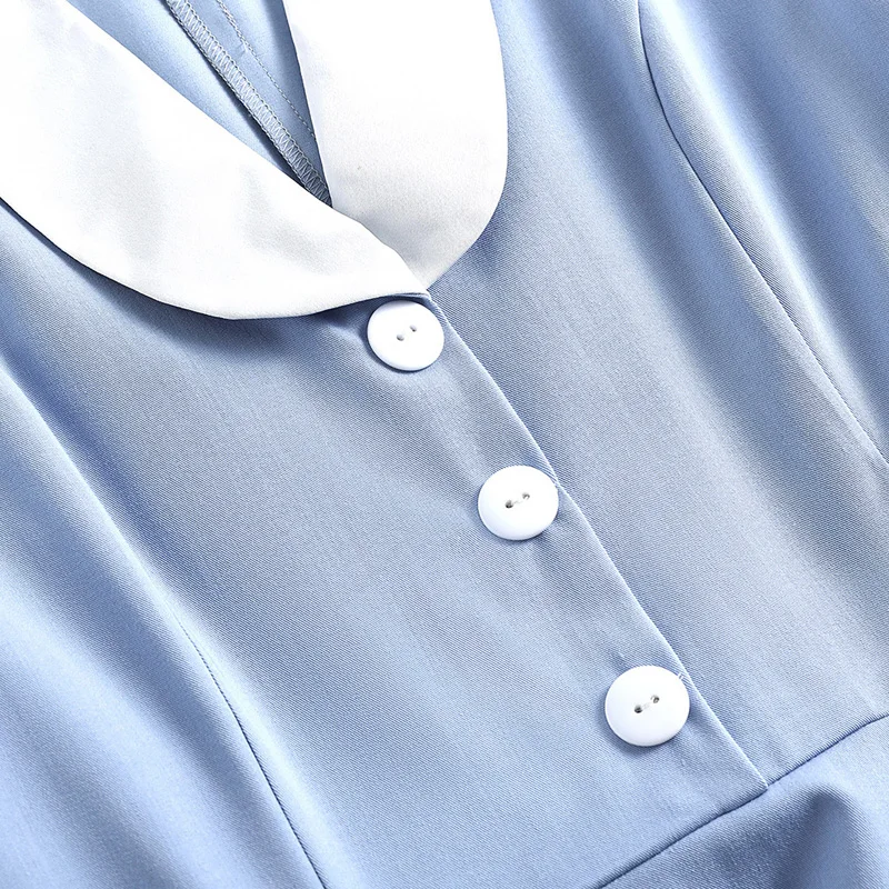 Light Blue Contrast Collar Button Up Short Sleeve Pockets High Waist Vintage Midi Swing Dress