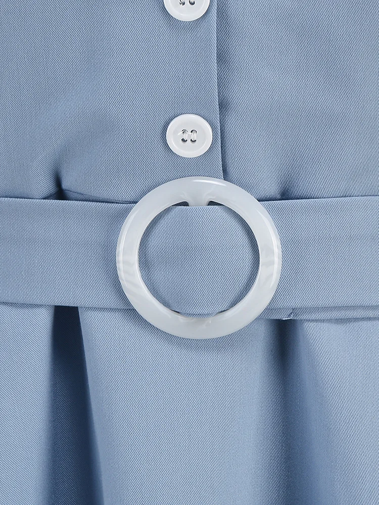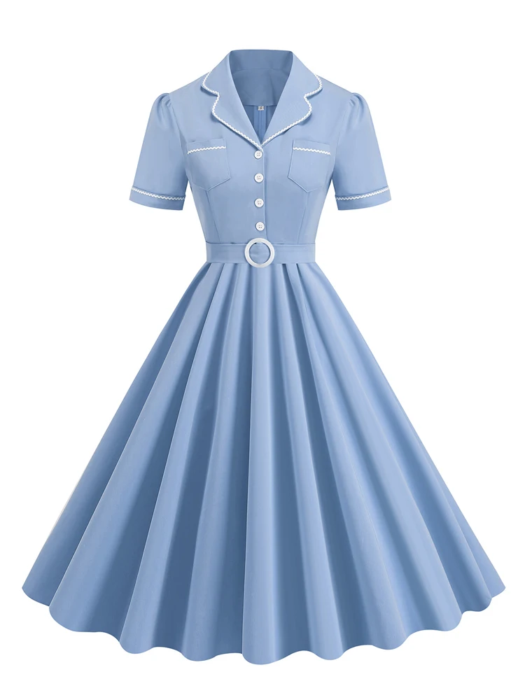 Notched Collar Pockets Front Formal Blue Solid Long Dresses for Women Summer Button Up Elegant Vintage Swing Dress