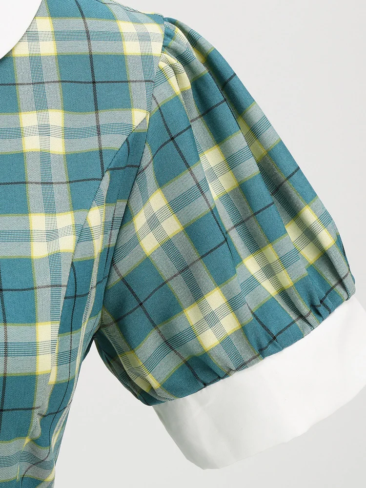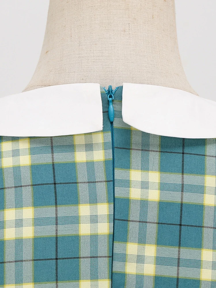 Penter-Pan Collar Button Front Green Plaid Rockabilly Vintage Dresses for Women High Waist Elegant A-Line Dress