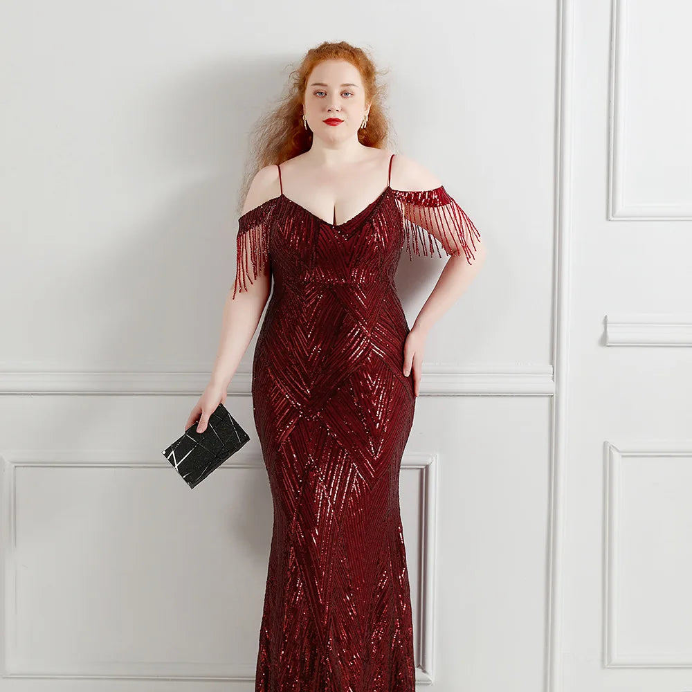 Plus Size Burgundy Sequin Dress Sexy Beading Evening Dress Women Party Strap Maxi Dress Long Prom Dress