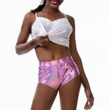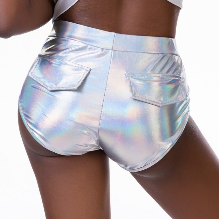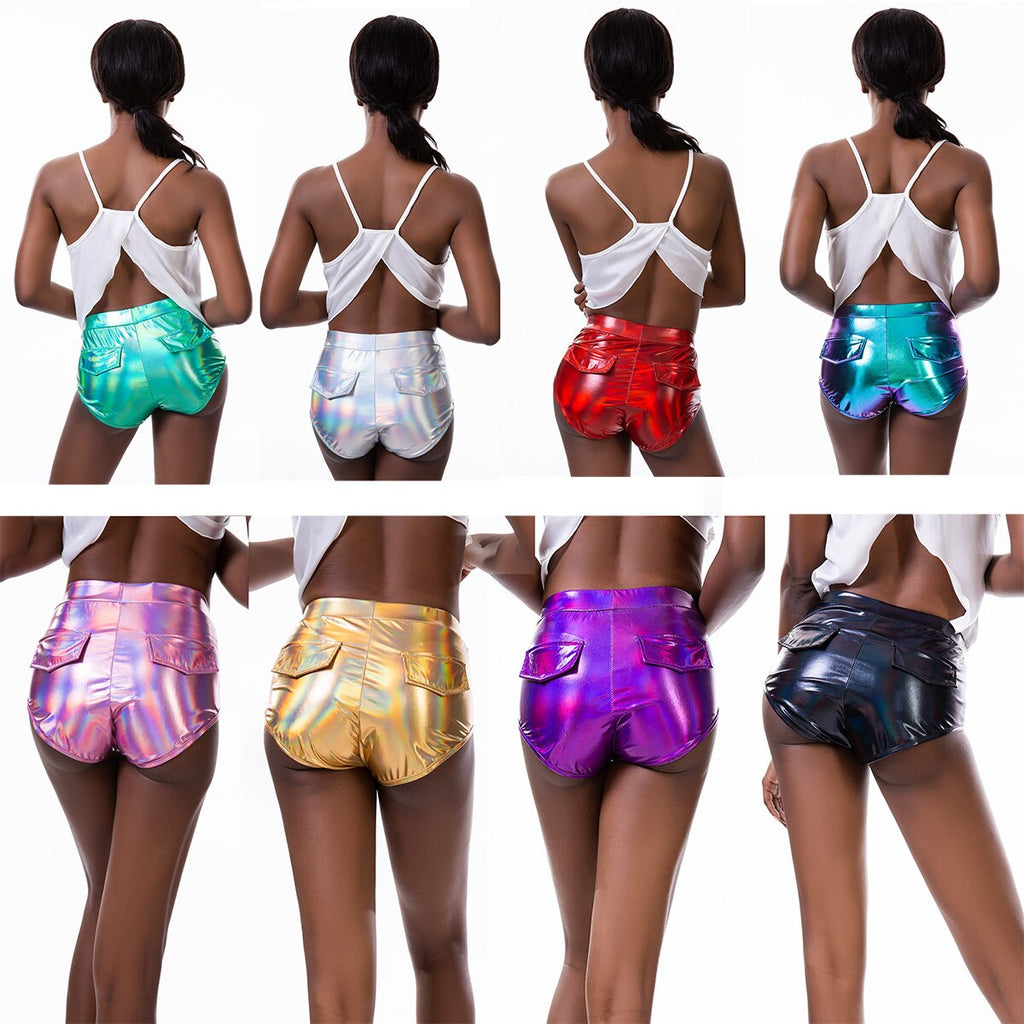 Shiny Sexy Holographic Shorts with Pockets Night Club Laser Metallic Wet Look Booty Party Raves Festival Slim Shorts