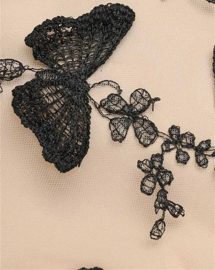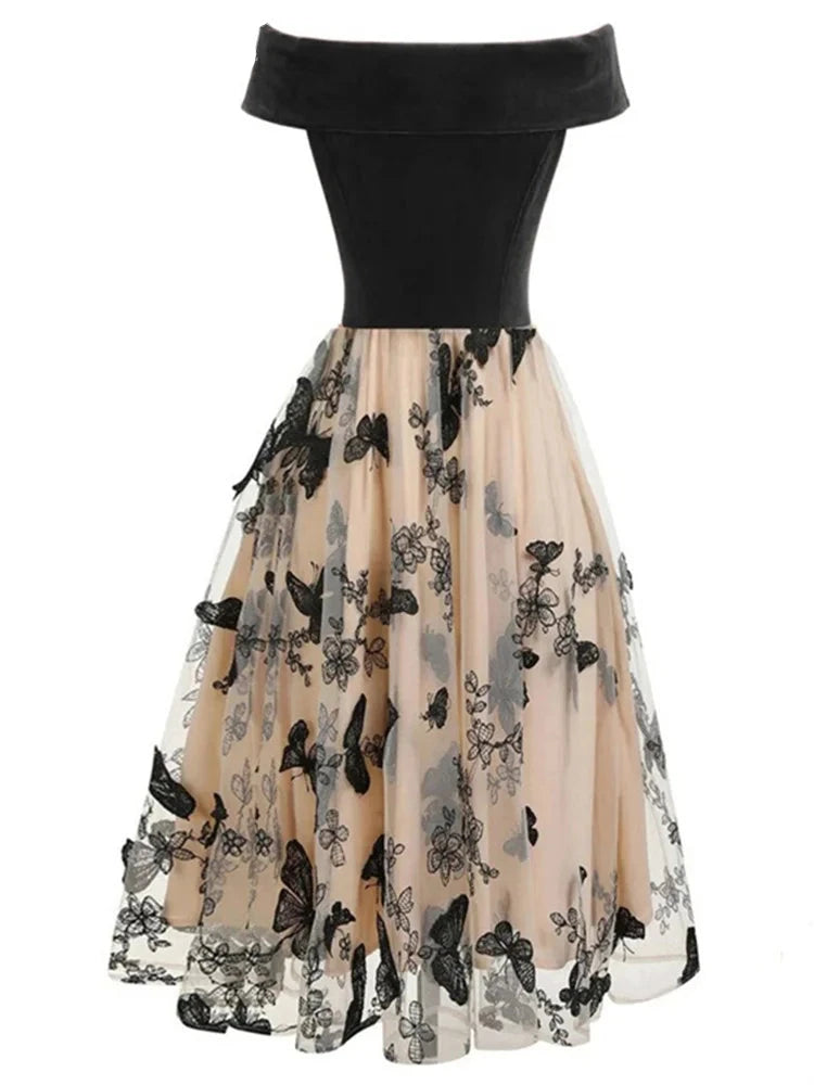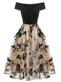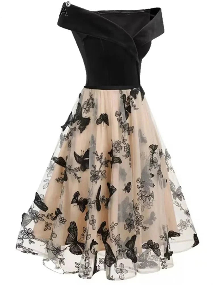 Slash Neck Embroidery Office Vintage Women's Party Dress Elegant Butterfly Patchwork 2 Layer Mesh Dance Short Evening Dresses