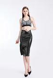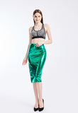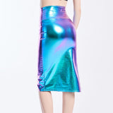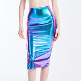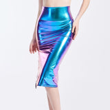 Summer Holographic Thigh Splits Bodycon Midi Skirt Sexy Metallic Wet Look Laser Blue Pencil Skirt Festival Rave Clothing