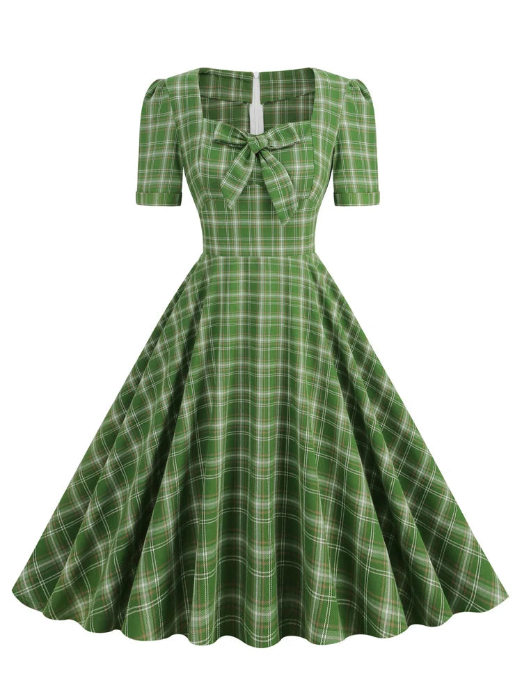 Sweetheart Neck Bow Front High Waist Green Plaid Long Dress Vintage 1950S Women Elegant Evening Formal Swing Dresses