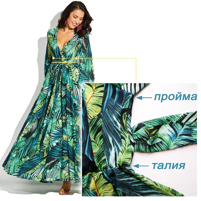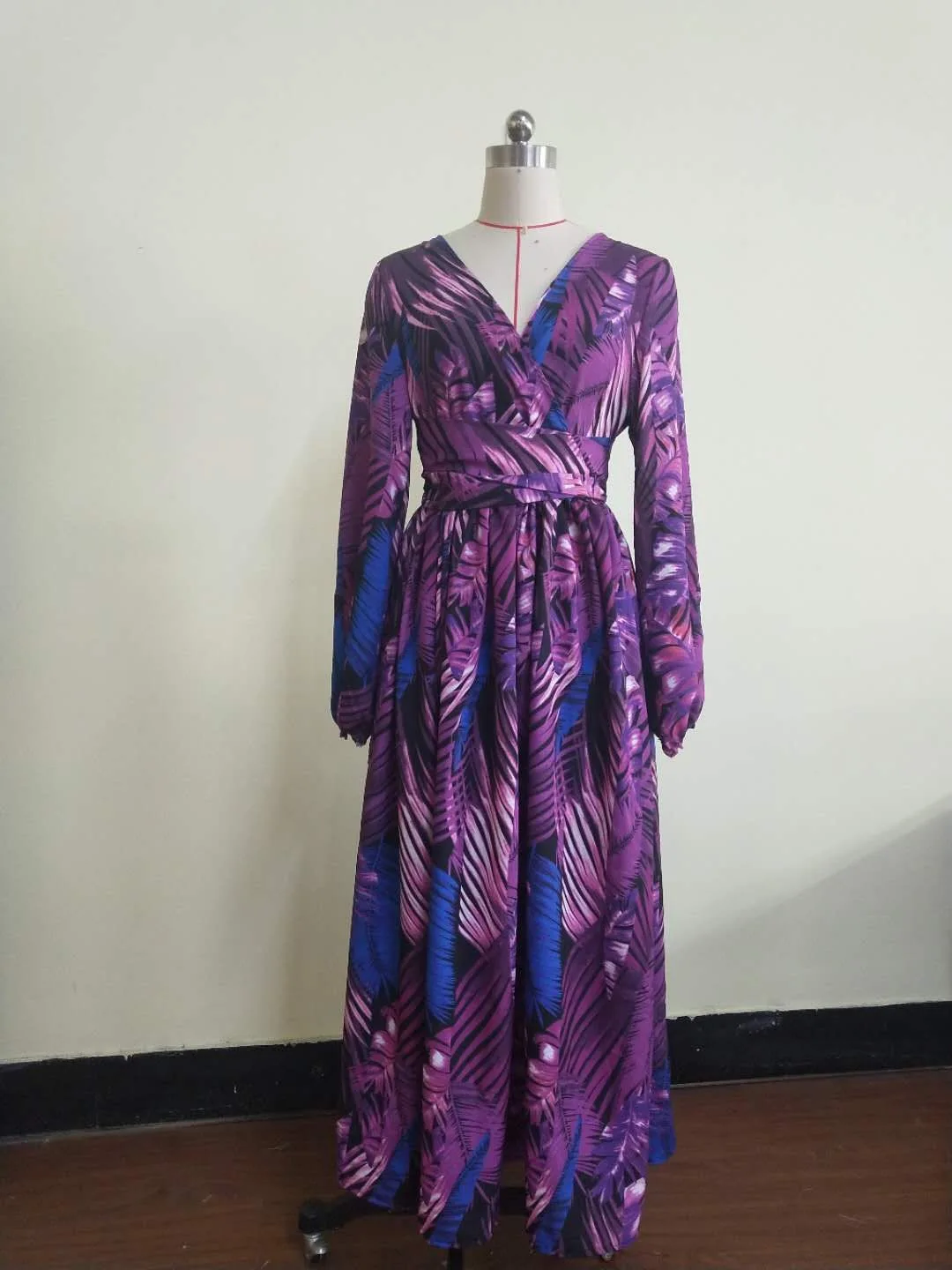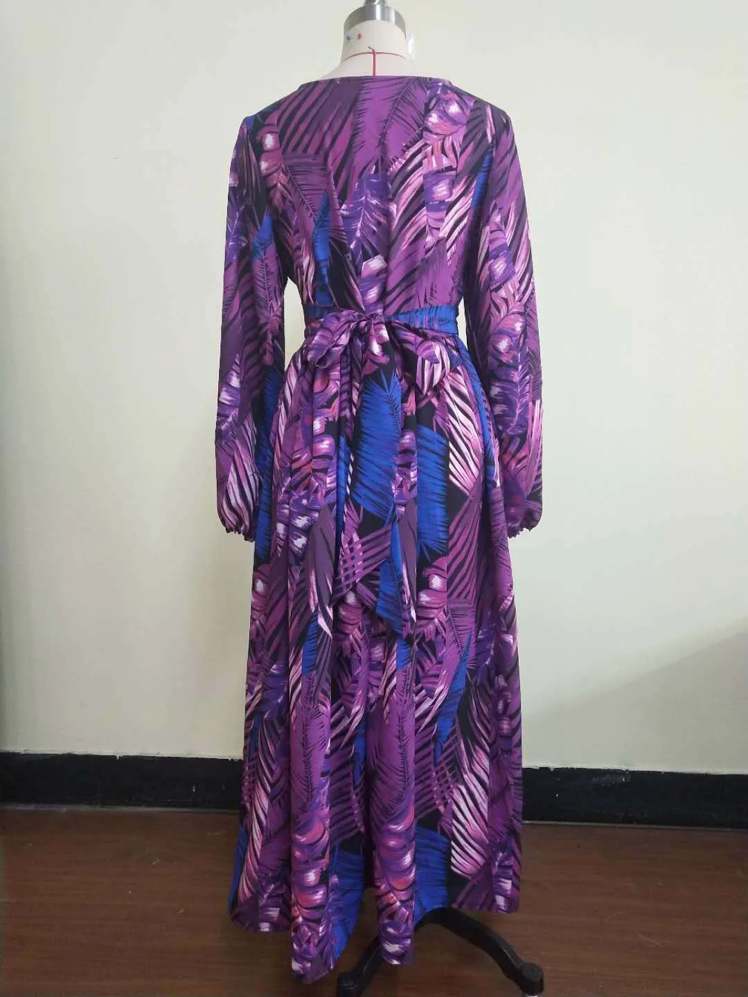 V-Neck Floral Print Ruffle Beach Long A-Line Bishop Sleeve Street Wear Casual Party Dress Robe