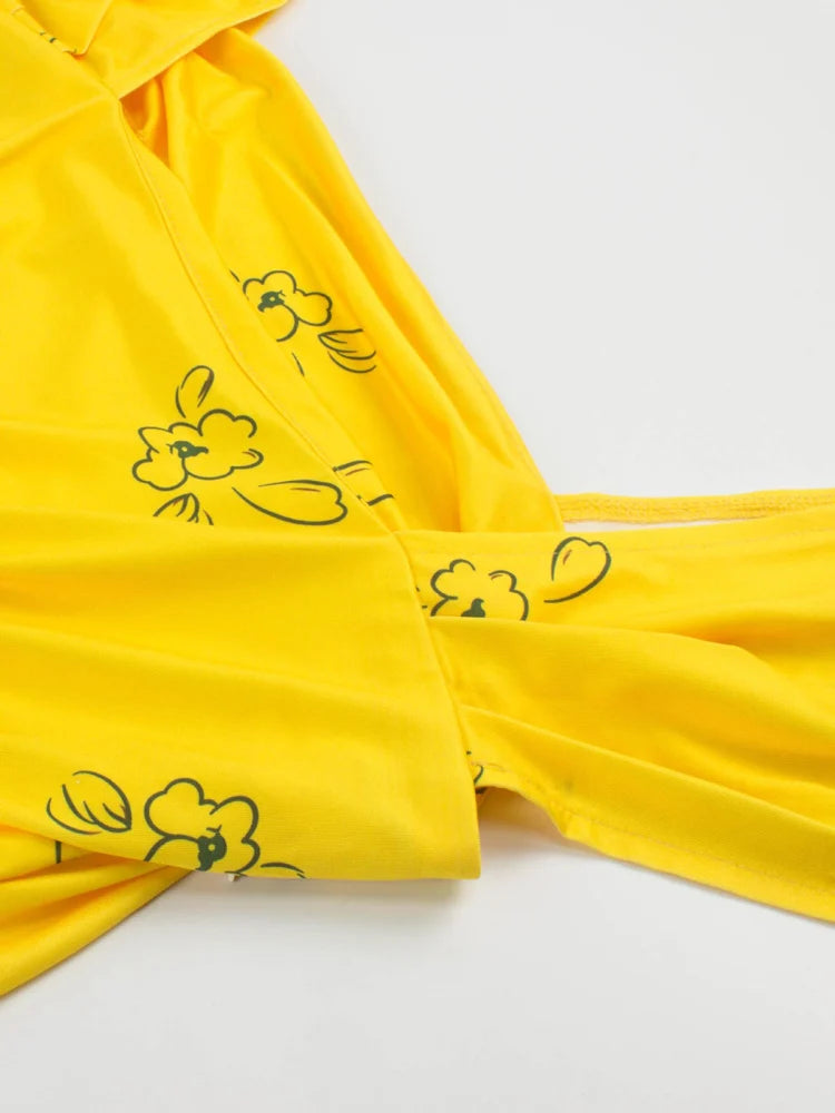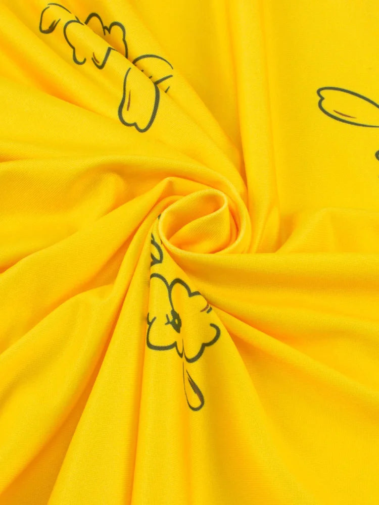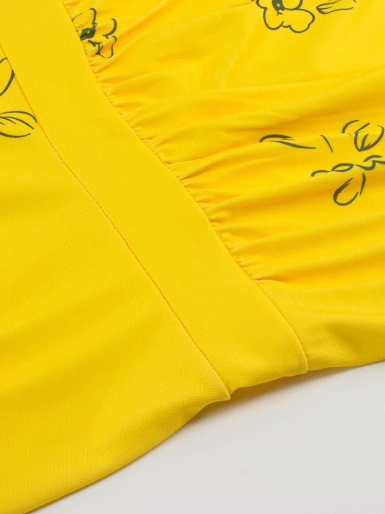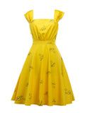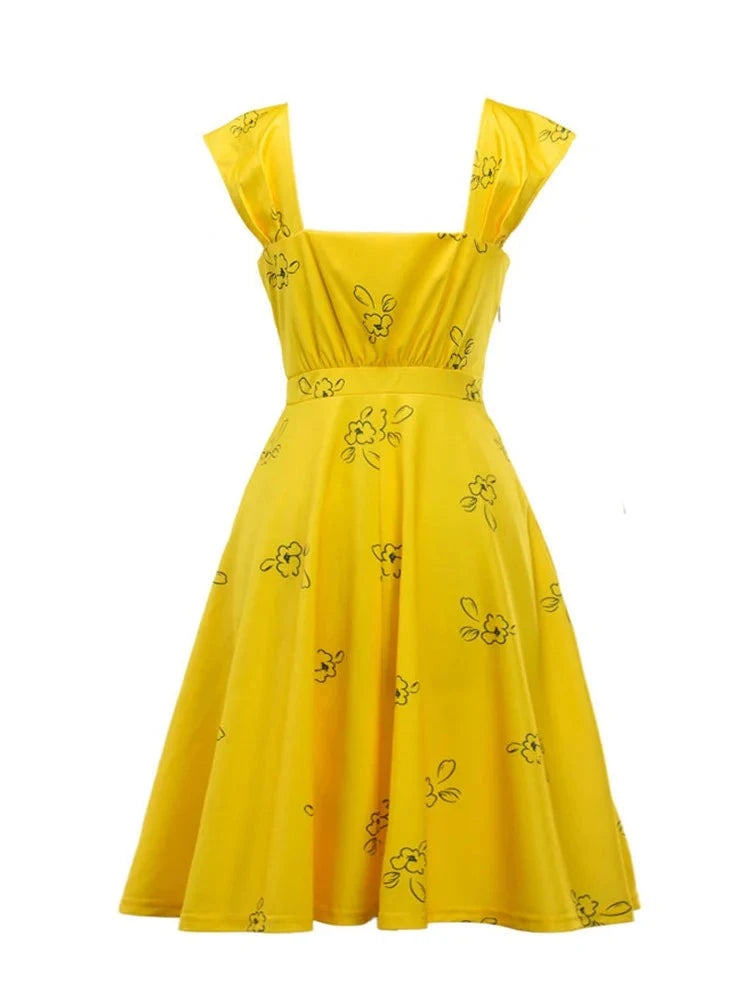 Vintage Yellow Cute Floral Print Dresses Casual Summer Women Cap Sleeve Square Collar Backless Elegant Skater Dress